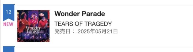 TEARS OF TRAGEDY ライヴアルバム『Wonder Parade』が、オリコン週間インディーズアルバムランキングにて12位にランクイン!